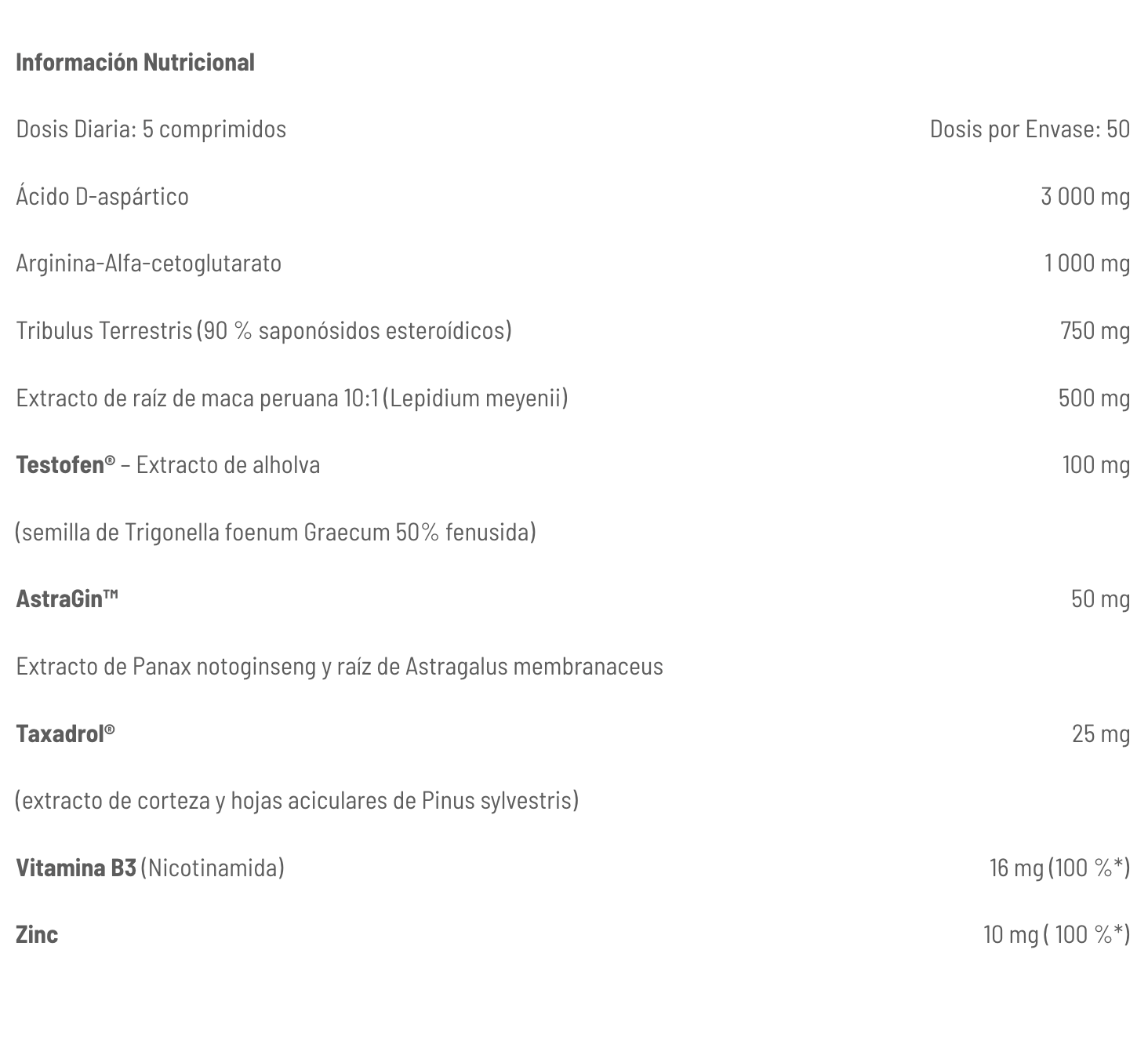 Anabólico natural con ingredientes premium como Zinc, Arginina AKG, Tribulus Terrestris, Maca, Testofen® y AstraGin™, diseñado para apoyar los niveles de testosterona, la vitalidad y el desarrollo muscular.