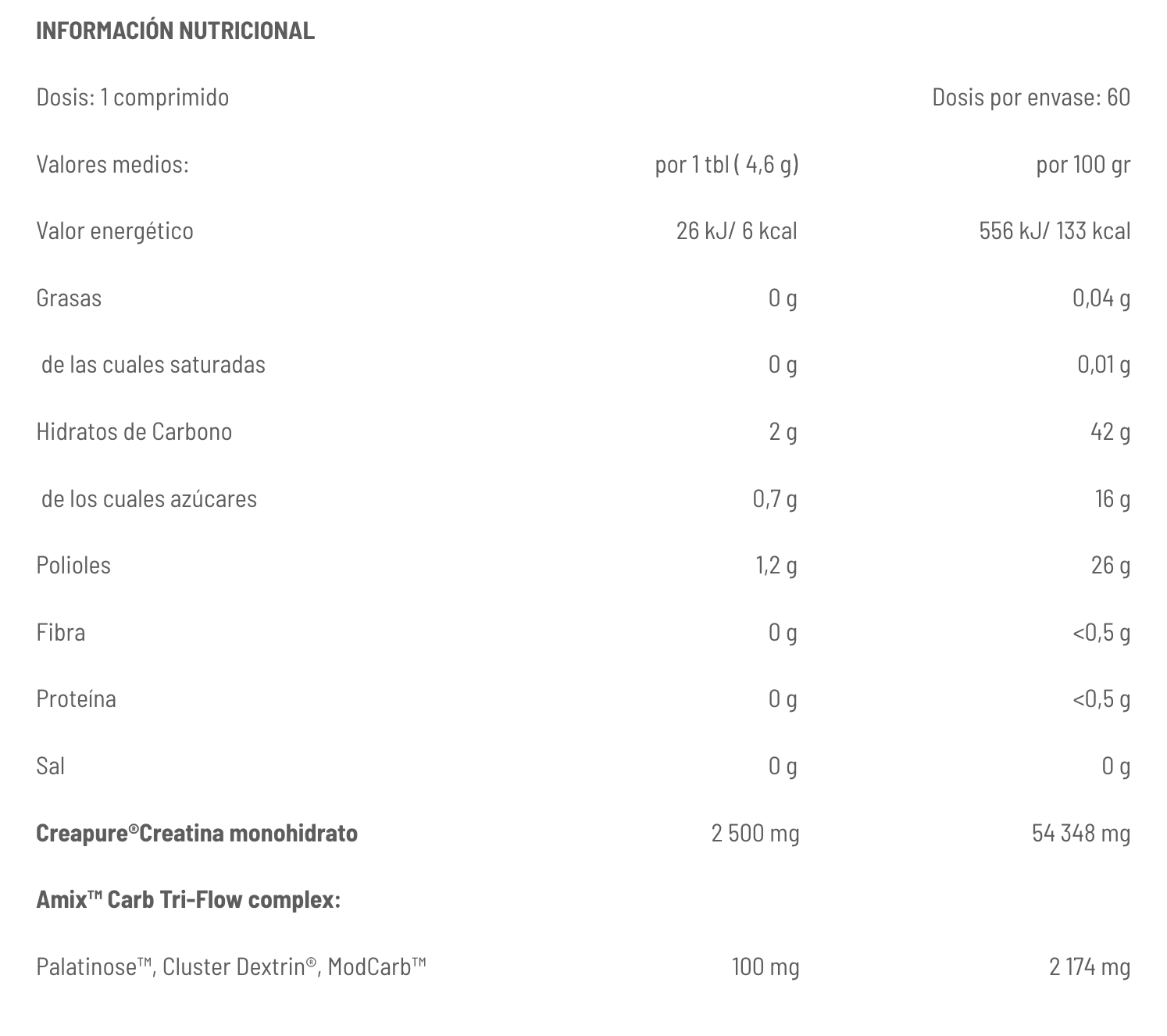 2,5 g de creatina Creapure® por comprimido – la forma más pura y eficaz.