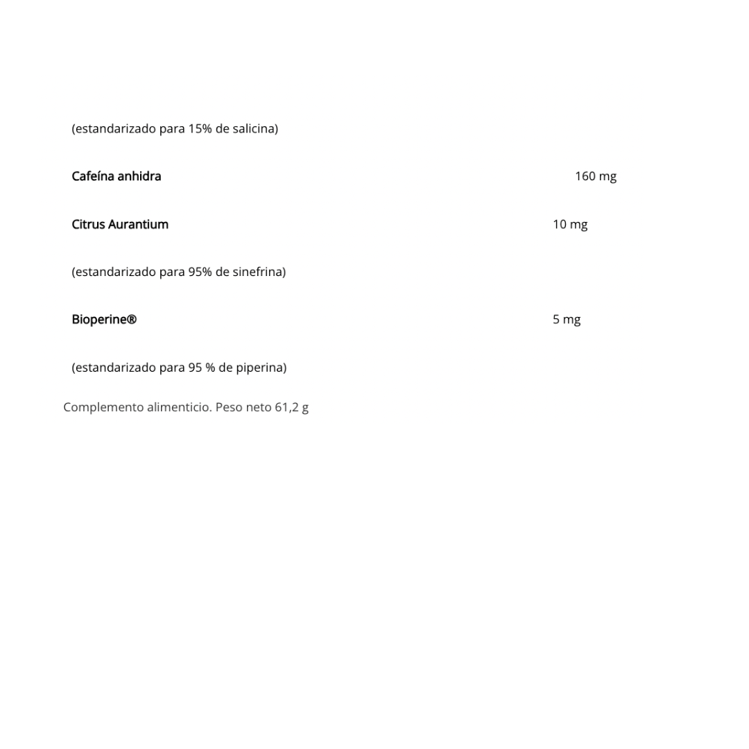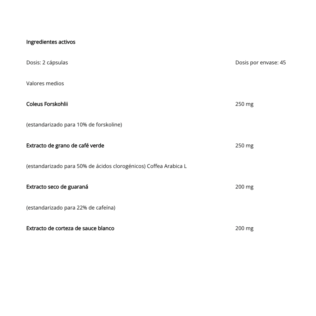 Fórmula avanzada con 7 ingredientes clave: Coleus Forskohlii, Guggul, Cafeína, Guaraná, Té Verde, Salix Alba, Citrus Aurantium y BioPerine®.