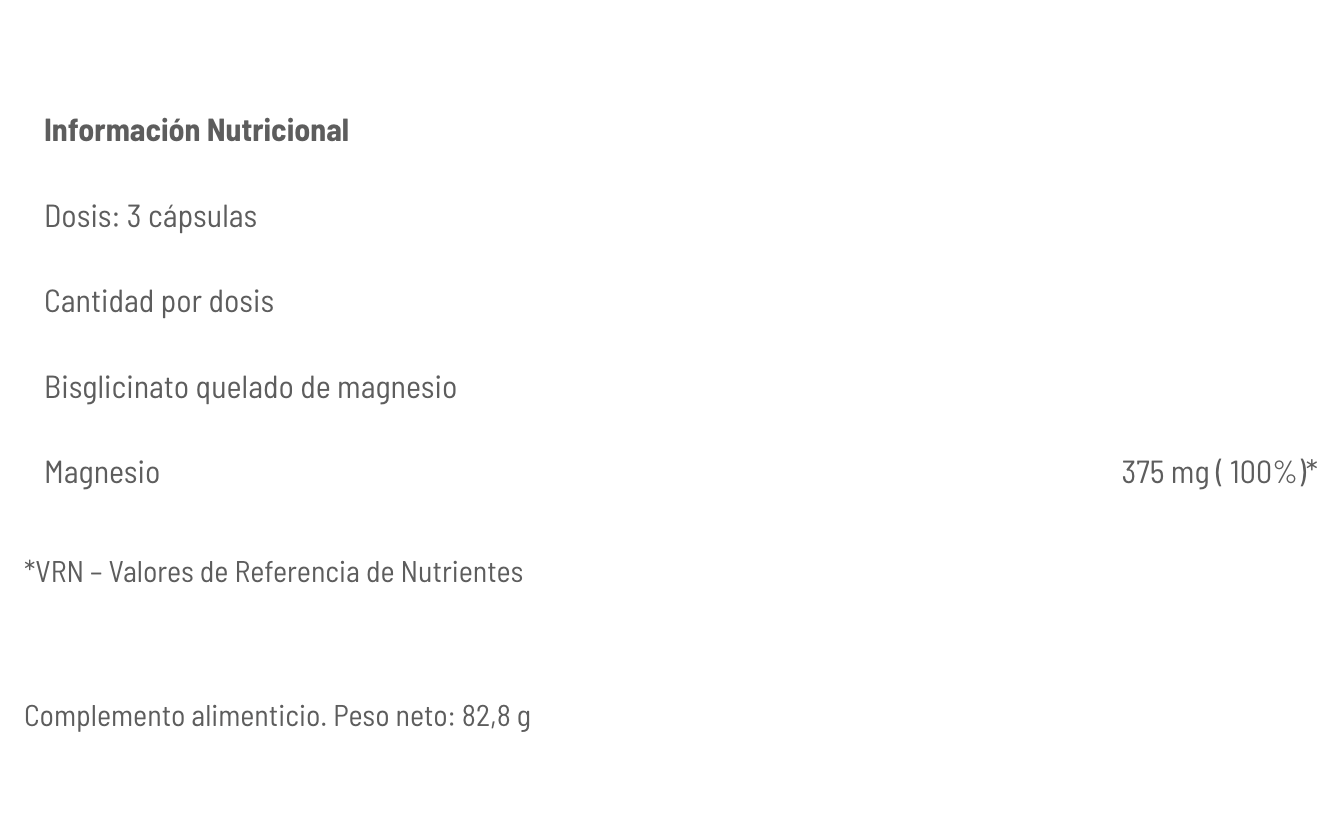 Ingredientes: ChelaZone® bisglicinato de magnesio quelado, antiaglomerante: celulosa microcristalina; cápsula vegetal (hidroxipropilmetilcelulosa, agua purificada, colorante: carbonato de calcio), antiaglomerantes: estearato de magnesio vegetal y dióxido de silicio.