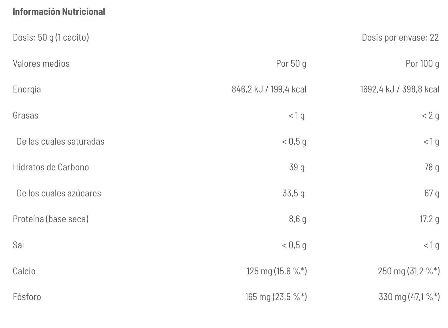 Dosis diaria recomendada: 50 g (1 cacito) en 200–300 ml de agua, 30–45 min antes del entrenamiento.