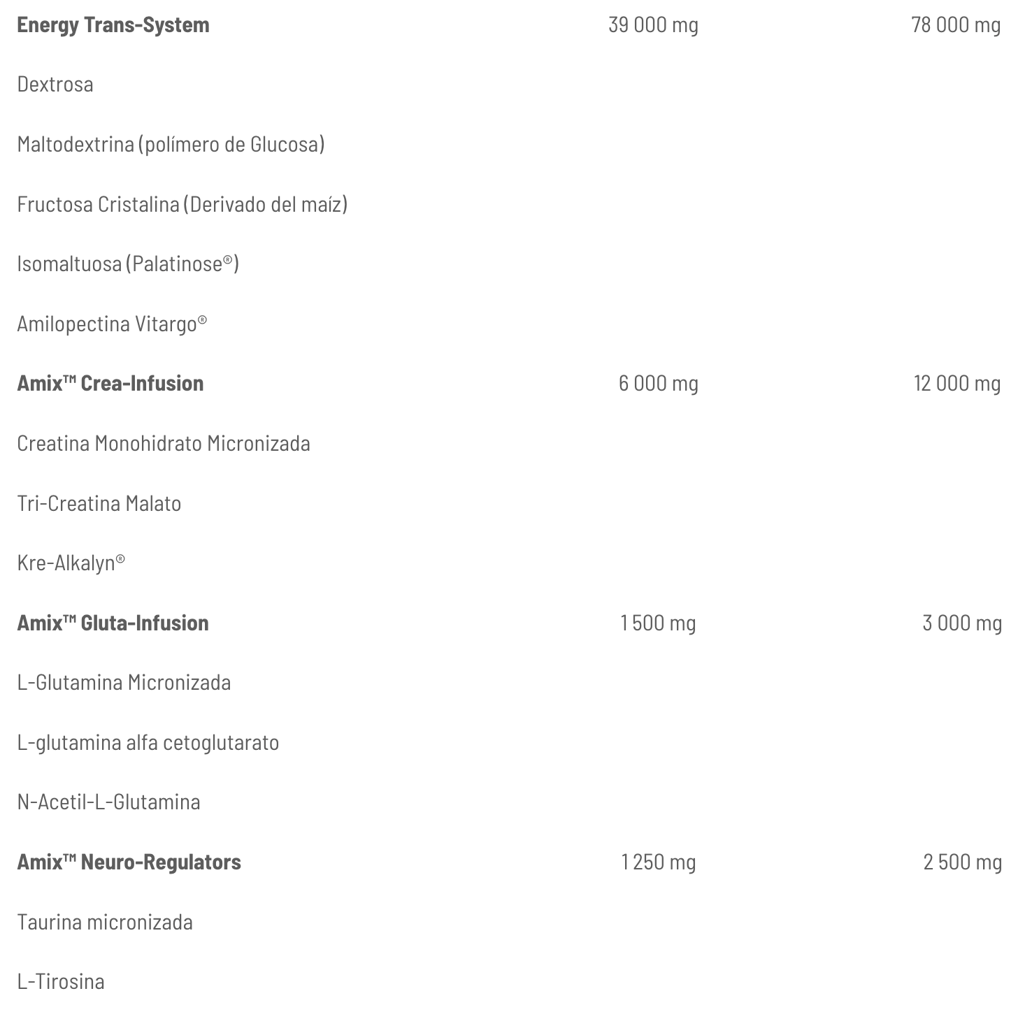 Pre-entrenamiento avanzado con carbohidratos, creatina, glutamina y óxido nítrico.